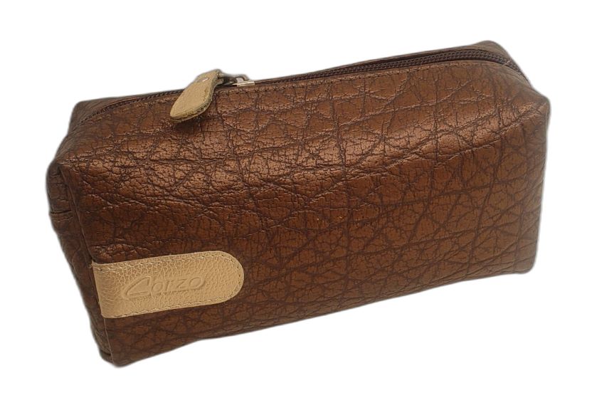 Cosmetiquera, en cuero legítimo, con buen volumen y cremallera en la parte superior.